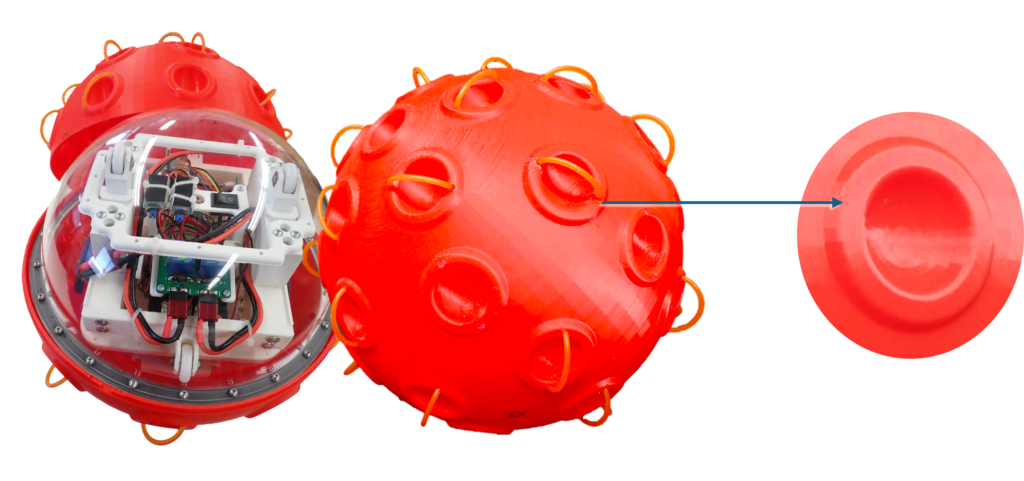 本発明の概要:特許内容は、球体ロボットに装着する外装部の構造、材料と除草方法です。土壌の掻き出しと攪拌の機能を有する円形状突起部のような取り外し式の柔軟な凹凸突起部を外装ベース(外球)に装着するもので、雑草の種類、土壌の性質、球体ロボットを投入する時期によって変更可能です。現在、突起ベースはPLA樹脂製、掻き出しパーツはTPU95A(ゴムライク)ですが、今後突起ベースも柔軟素材にすることでイネへの影響を小さくする予定です。